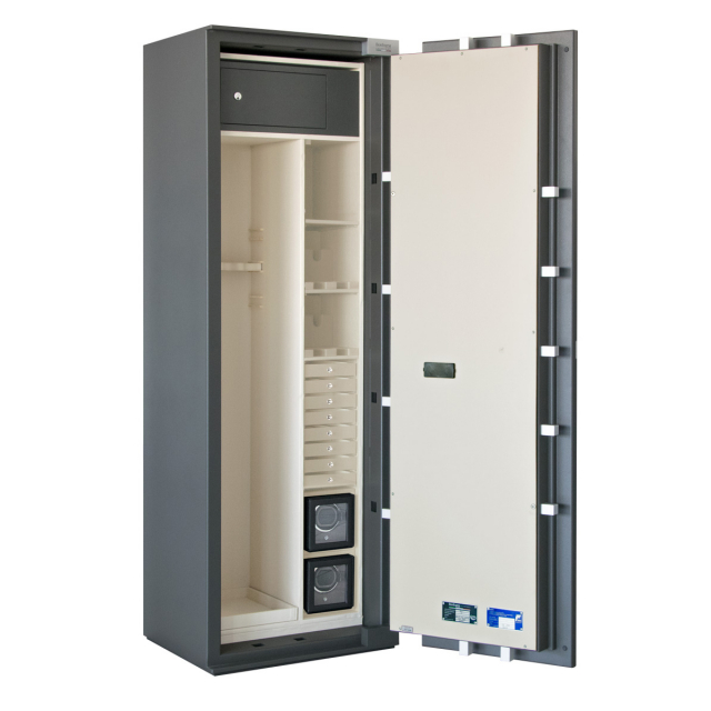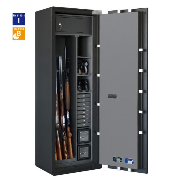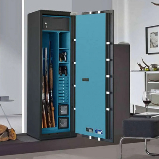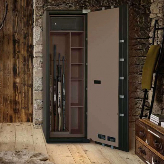La versione Premium può contenere fino a 4 fucili, presenta una sezione a ripiani che può essere allestita con cassetti, rotori per orologi o portapistole.