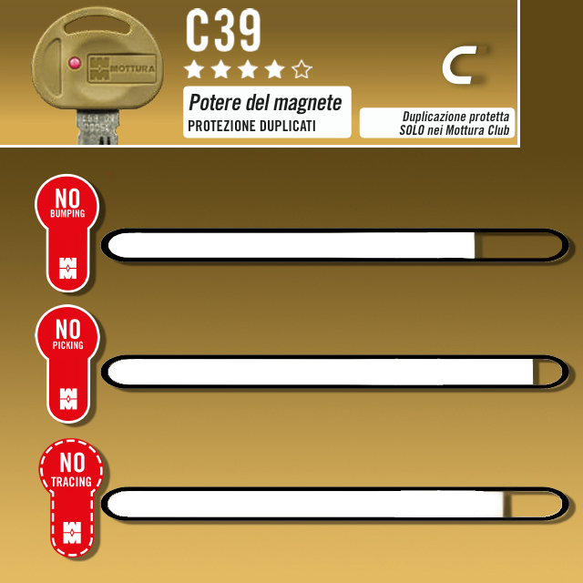 Nuovo cilindro di sicurezza Champions anti-bumping, anti-picking e anti-tracing. La sua chiave presenta controlli profilo "in asse" sagomati (con simboli matematici + x - / ) e laterali brevettati e profilo MM brevettato. E' inoltre dotata di un magnete anti-grimaldello. La duplicazione chiavi è protetta e consentita solo presso i Centri autorizzati Mottura Club.