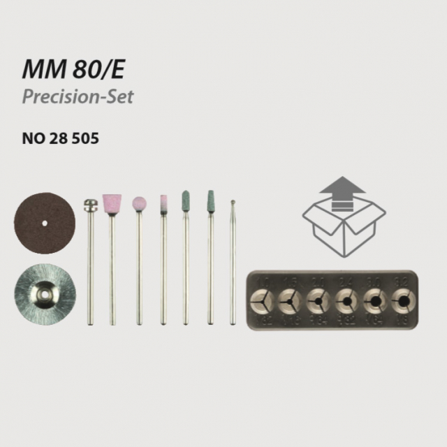 Disponibile come set di precisione MM 80/E con pinze di alta precisione o come set universale MM 80/EF con mandrino flessibile. Include un kit di accessori di base. Conservato correttamente nella nuova scatola MICROMOT. A proposito: nessun ulteriore imballaggio di vendita! Con alimentatore switching da 230 Volt – non è necessario un trasformatore separato!
