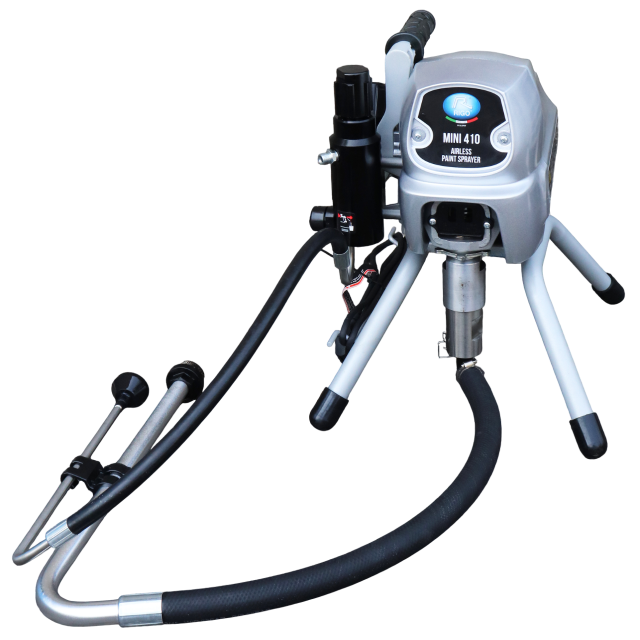 Pompa Airless Elettrica a pistone MINI 410 da 2,1 lt/min con motore elettrico di qualità industriale - 227 Bar, potenza 840 W - 1,2 Hp a 230V/50 hz, Peso 14,5 kg completa di tubo 1/4" - 15 m, Pistola, corpo ed ugello fino a 0.021" con controllo della pressione affidabile per uno spruzzo omogeneo