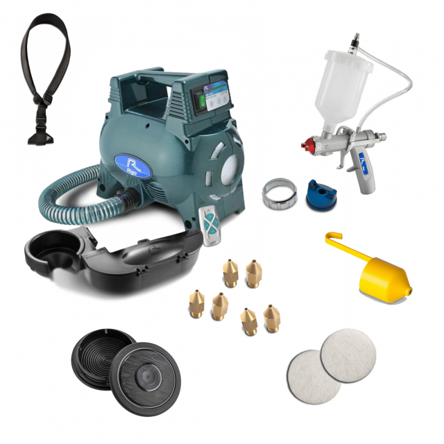 L’apparecchiatura inoltre produce aria calda e secca (diminuendo in media del 40% l’umidità relativa), tutto a vantaggio di una migliore e più rapida essicazione del materiale. Il top di gamma per prestazioni. Col suo motore da 1800 W permette una rapidità sorprendente nell’applicare tutti i materiali coprenti. Le nuove caratteristiche permettono anche di spruzzare di materiali molto densi e difficili.