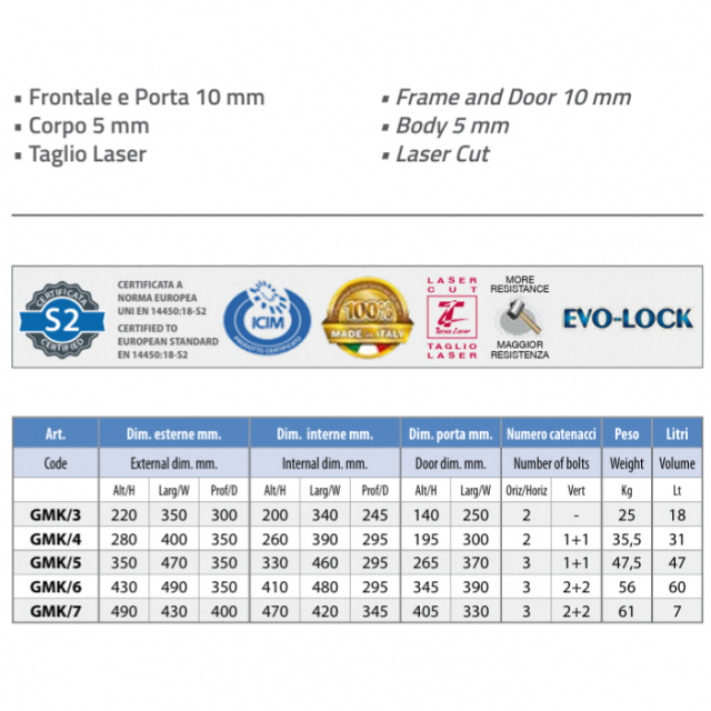 Catenacci orizzontali e verticali superiori protetti da una piastra in acciaio al manganese dello spessore di 3 mm., posizionata in obliquo al fine di ottenere la massima resistenza antitrapano.