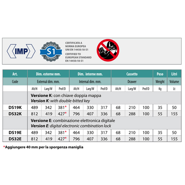 Ideale per il deposito temporaneo in locali commerciali, negozi, stazioni di servizio e banche di eccedenze di cassa, di ricevute degli incassi e deposito di documenti che vengono depositati in un cassetto dotato di un sistema anti-ripescaggio cadendo nella cassaforte (mod. DS19K) o nella cassetta interna (mod. DS32K). CERTIFICATO da IMP secondo la norma europea EN 14450-S1
