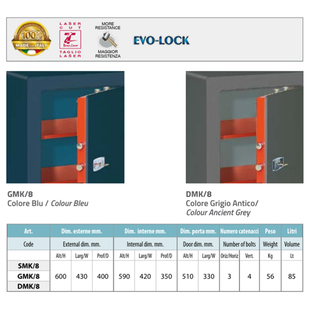 Serratura di alta sicurezza di ultima generazione, con 8 leve asimmetriche ed indipendenti, certificata UNI EN 1300. Si basa sull’utilizzo di nuove leve antipicking oscillanti e mentonnet a profilo speciale che oppongono una eccezionale resistenza agli attacchi portati utilizzando gli ultimi sofisticati sistemi di manipolazione con l’uso di speciali grimaldelli es"attrezzo bulgaro".